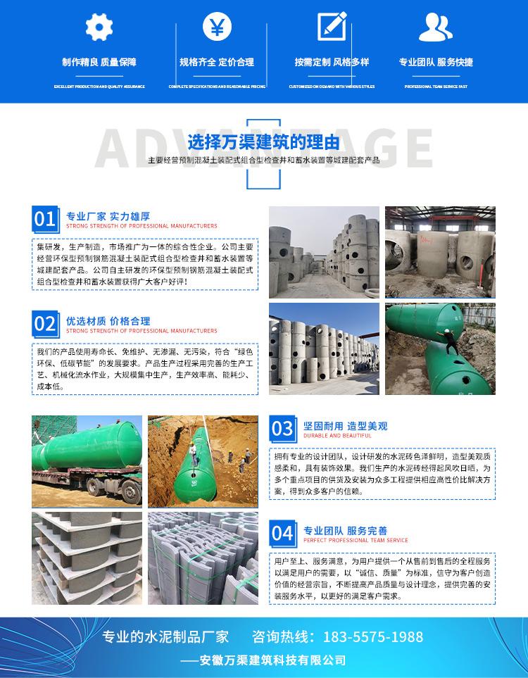 安徽萬渠建筑科技有限公司是集研發(fā),生產(chǎn)制造,市場推廣為一體的綜合性企業(yè)。公司主要經(jīng)營環(huán)保型預(yù)制鋼筋混凝土裝配式組合型檢查井和蓄水裝置等城建配套產(chǎn)品。產(chǎn)品生產(chǎn)過程采用獨特的生產(chǎn)工藝,機械化流水作業(yè)。產(chǎn)品大規(guī)模生產(chǎn),生產(chǎn)效率高,耗能少,成本低,產(chǎn)品使用壽命長、免維護、無滲漏、無污染,符合“綠色環(huán)保,低碳節(jié)能”的發(fā)展要求,是傳統(tǒng)磚砌井池的理想替代產(chǎn)品。